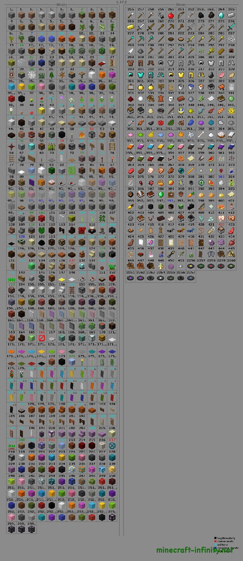 Обращаем внимание, что картинка выше актуальна лишь для Майнкрафт Java Edition до версии 1.12.2 включительно. В Майнкрафт версиях 1.13.2, 1.14.4 и новее цифровые ID больше не работают. Они были полностью заменены на буквенные названия, полный список ты сможешь найти на вики.